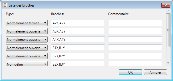 La liste des broches est enregistrée dans la base de données au format requis par le programme, par exemple : 1,A1X,A1Y;2,A2X,A2Y;1,A3X,A3Y;1,A4X,A4Y;1,B1X,B1Y;1,B2X,B2Y;1,B3X,B3Y;1,B4X,B4Y.