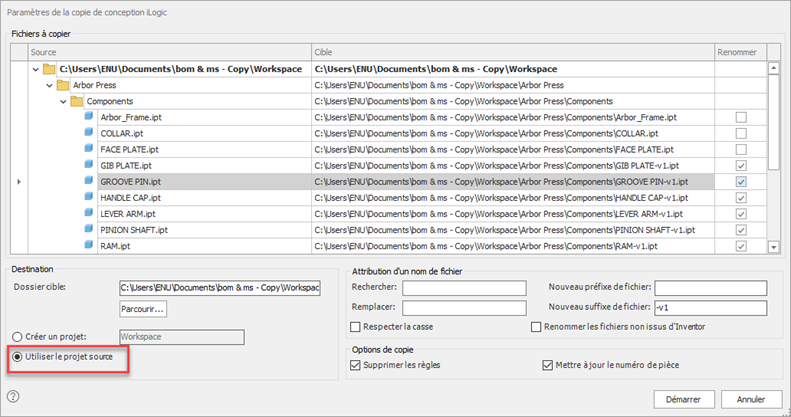 Il est désormais possible de réutiliser les fichiers sans les copier et sans créer de fichier de projets. Si le dossier cible est similaire au dossier source, choisissez l’option « Utiliser le projet source » dans la boîte de dialogue Paramètres de la copie de conception iLogic et spécifiez le préfixe ou le suffixe souhaité, ou les options Rechercher et remplacer pour renommer les fichiers. Ensuite, désélectionnez l’option Renommer dans les fichiers spécifiques que vous ne souhaitez pas renommer.