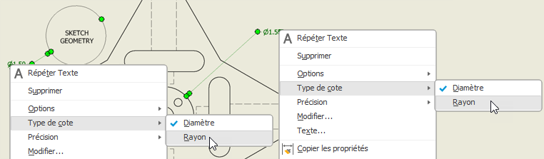 Modifiez les cotes de diamètre ou de rayon existantes pour changer leur type. Utilisez pour cela les cotes pilotées :