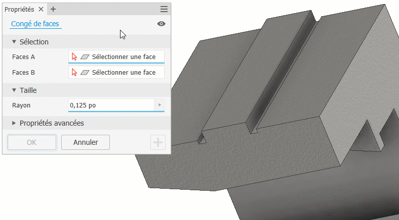 Ajoute une fonction de congé entre deux faces non adjacentes d’un solide unique. S’il existe des fonctions contiguës, celles-ci sont bouchées et remplies pour créer le congé.