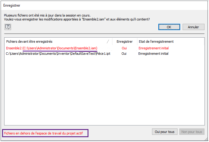 L’option Enregistrer a été améliorée pour vous permettre d’identifier rapidement les fichiers que vous êtes sur le point d’enregistrer qui ne sont pas dans votre projet actif. Les fichiers qui ne se trouvent pas dans le projet actif s’affichent en rouge.