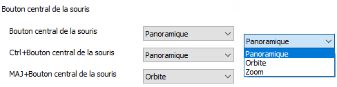 L’onglet Affichage de la boîte de dialogue Options d’application fournit désormais des paramètres qui vous permettent d’attribuer l’opération de zoom, de panoramique ou d’orbite au bouton central de la souris.