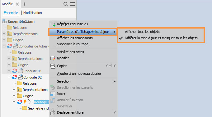 Vous pouvez désormais accéder aux commandes Afficher tous les objets et Différer la mise à jour et masquer tous les objets dans le menu contextuel du routage.