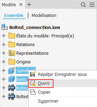 Vous pouvez désormais sélectionner plusieurs composants et sous-ensembles dans le navigateur et ouvrir le jeu de sélection dans de nouvelles sessions d’Inventor. Cliquez sur le jeu de sélection avec le bouton droit de la souris, puis sélectionnez Ouvrir.