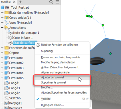 Lorsque vous modifiez une annotation 3DA comportant une ligne de repère, vous pouvez cliquer avec le bouton droit de la souris et choisir Ajouter un sommet ou Supprimer un sommet pour modifier l’aspect de la ligne de repère. Dans cette version, la position de ces deux commandes a été déplacée dans le menu contextuel.