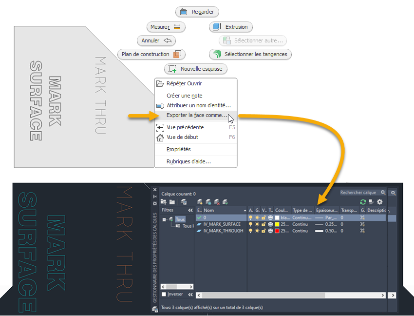 Lorsque vous utilisez la commande Exporter la face comme pour exporter des faces avec des fonctions de marque au format DXF, les paramètres de calque Style de marque sont conservés dans le fichier DXF.