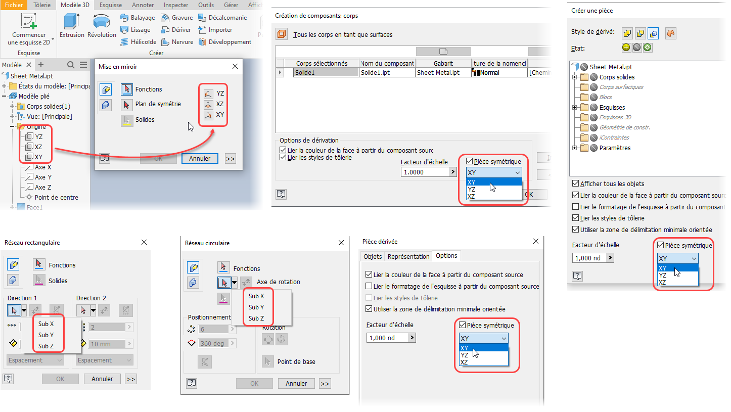 Les noms personnalisés affectés aux fonctions de construction de l’origine sont désormais reconnus et renseignés dans les différentes boîtes de dialogue, telles que Symétrie, Créer des composants, Créer une pièce, Réseau rectangulaire et circulaire et Pièce dérivée.