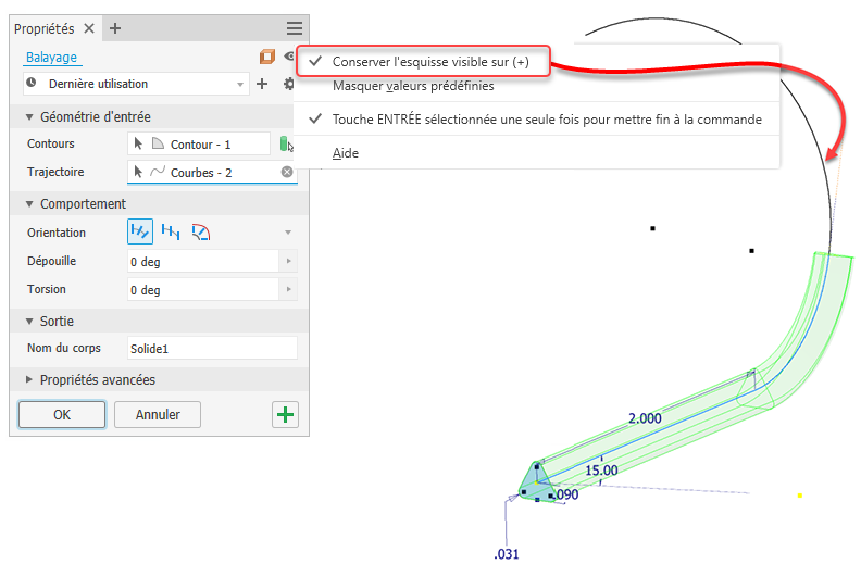 Lorsque vous utilisez la commande Balayage, vous avez la possibilité de conserver l’esquisse de trajectoire visible lorsque vous utilisez l’option Appliquer pour créer un segment de balayage. Dans le panneau de propriétés Balayage, dans le menu des paramètres avancés, sélectionnez l’option Conserver l’esquisse visible sur (+).