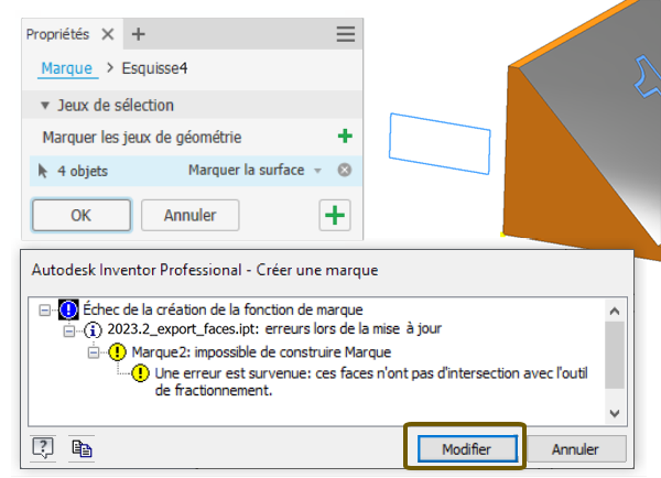 Certaines conditions peuvent entraîner l’affichage d’un message d’erreur. Par exemple, cela peut survenir quand une modification supprime la géométrie d’esquisse sur la géométrie d’un modèle. Dans ce cas, vous pouvez modifier l’esquisse à partir de la boîte de dialogue d’erreur pour résoudre rapidement le problème.