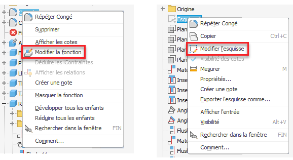 Il est désormais possible d’utiliser les touches de raccourci du menu contextuel pour modifier directement des esquisses ou des fonctions. Sélectionnez une fonction ou une esquisse, cliquez avec le bouton droit de la souris et utilisez la touche de raccourci. Les touches de raccourci suivantes sont disponibles :