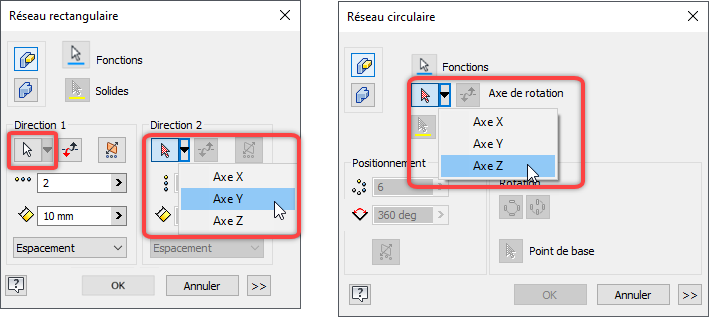 Les commandes de réseaux de fonctions (Rectangulaire et Circulaire) disposent désormais d’une icône déroulante de sélection qui permet d’accéder aux axes d’origine.