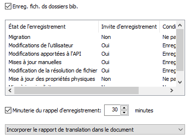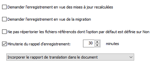 Les invites État de l’enregistrement remplacent les options Demander l’enregistrement en vue des mises à jour recalculées, Demander l’enregistrement en vue de la migration et Ne pas répertorier les fichiers référencés dont l’option par défaut est définie sur Non.