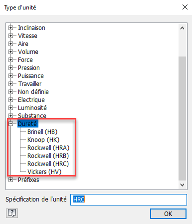 La dureté est un tout nouveau type d’unité ajouté pour cette version d’Inventor. Cela permet de spécifier la dureté dans la commande Terminer, mais peut également être utilisé seul. Les types suivants sont disponibles dans la boîte de dialogue Paramètres :
