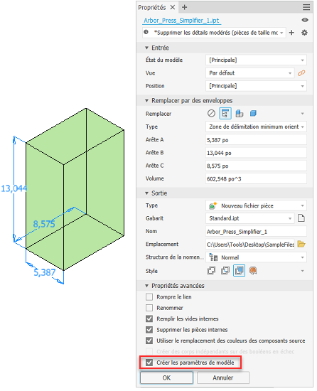 Une nouvelle option « Créer les paramètres de modèle » a été ajoutée aux propriétés avancées du panneau de propriétés. Lorsque cette option est sélectionnée, trois paramètres en lecture seule pour l’« arête A », l’« arête B » et l’« arête C » sont créés dans la fenêtre des paramètres du fichier simplifié.