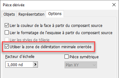 De plus, la représentation du composant sélectionné dans la pièce dérivée en tant que zone de délimitation orthogonale est désormais disponible pour les pièces. Cette option a été ajoutée aux boîtes de dialogue Pièce dérivée et Créer une pièce. Vous pouvez l’appliquer à un corps unique ou à l’intégralité du dossier Corps solides.