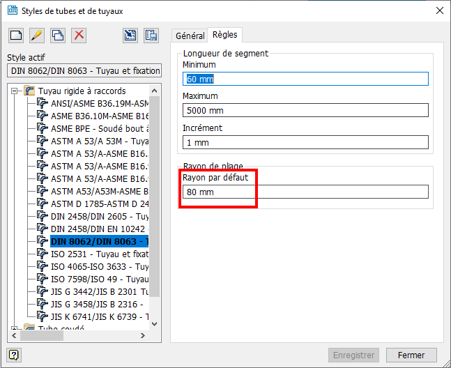 Dans la boîte de dialogue Styles de tubes et de tuyaux, le champ Rayon par défaut est désormais disponible pour tous les styles de tubes et tuyaux. Le rayon de pliage par défaut est égal à 2* la valeur de diamètre nominal. La valeur modifiée sera utilisée pour les nouveaux pliages personnalisés. Les routages existants comportant des pliages personnalisés seront mis à jour pour refléter la nouvelle valeur du rayon de pliage.