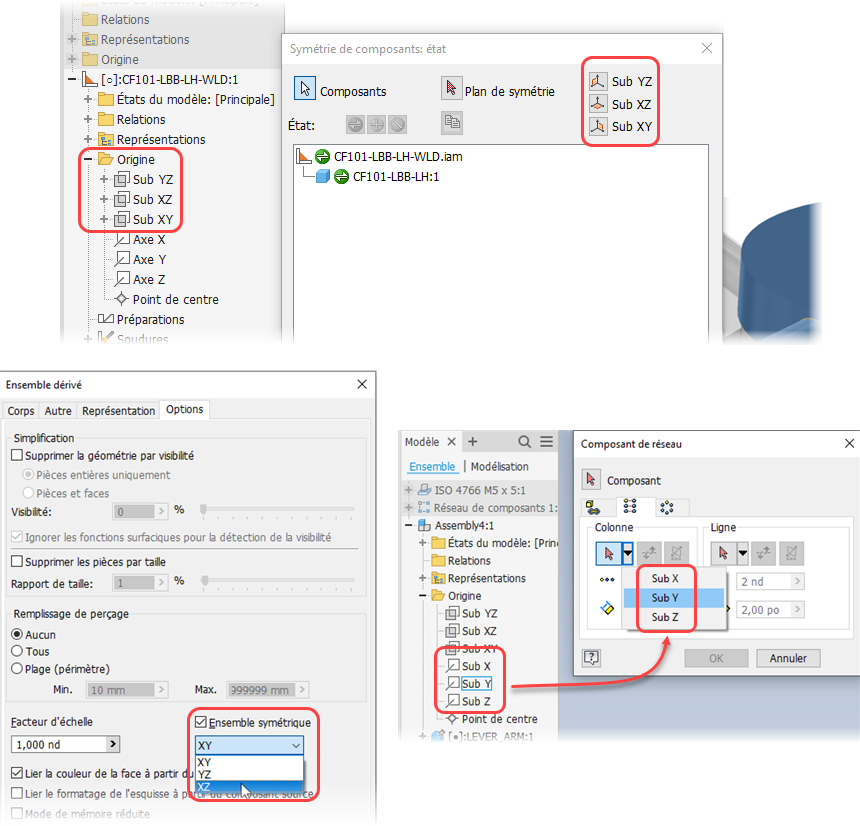 Les noms personnalisés affectés aux fonctions de construction de l’origine sont désormais reconnus et renseignés dans les différentes boîtes de dialogue utilisées pour les commandes telles que Symétrie de composants, Composant de réseau et Ensemble dérivé.