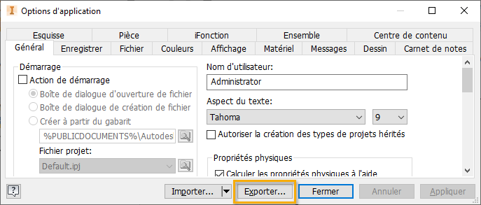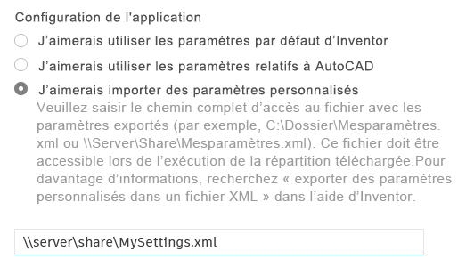 | Dans la boîte de dialogue Options d’application, cliquez sur Exporter. L’option Exporter permet d’enregistrer les options d’application actuelles et les paramètres de la boîte de dialogue Configuration iLogic dans un fichier .xml | Lors de la création de votre répartition, sélectionnez Je souhaite importer des paramètres personnalisés et entrez le chemin d’accès au fichier .xml exporté |