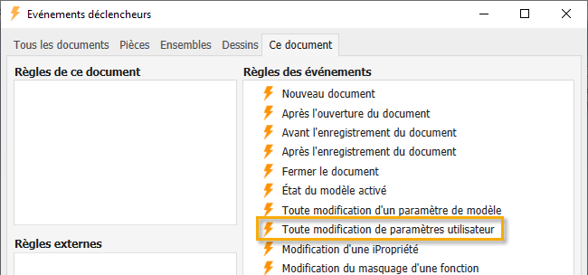 Il existe un nouvel événement nommé Toute modification de paramètres utilisateur dans la boîte de dialogue Événements déclencheurs. Cet événement est déclenché lorsque vous modifiez la valeur d’un paramètre utilisateur.