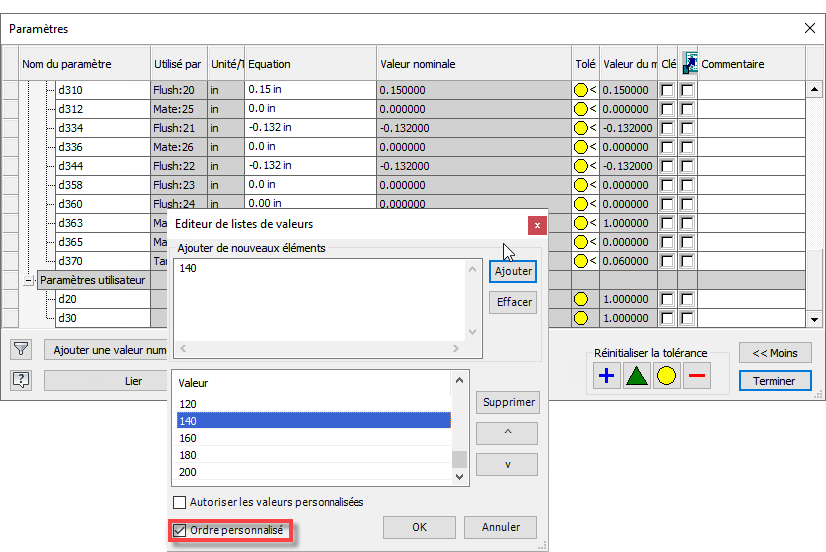 Vous pouvez désormais trier l’ordre des paramètres multivaleurs, par exemple en plaçant les valeurs les plus fréquemment utilisées en haut de la liste. Dans la boîte de dialogue Paramètres, cliquez avec le bouton droit de la souris sur un paramètre dans une colonne, sélectionnez Modifier la liste multivaleur et cochez la case Ordre personnalisé.