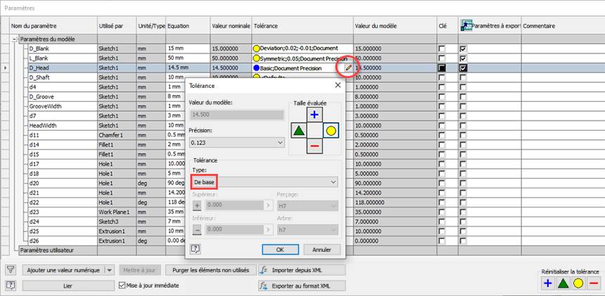 Auparavant, la colonne Tolérance de la boîte de dialogue Paramètres pouvait seulement prendre les valeurs Supérieur(e), Médian(e), Nominal(e) ou Inférieur(e). Vous pouvez maintenant cliquer sur une ligne de tolérance et sur l’icône en forme de crayon pour accéder à la boîte de dialogue Tolérance complète.