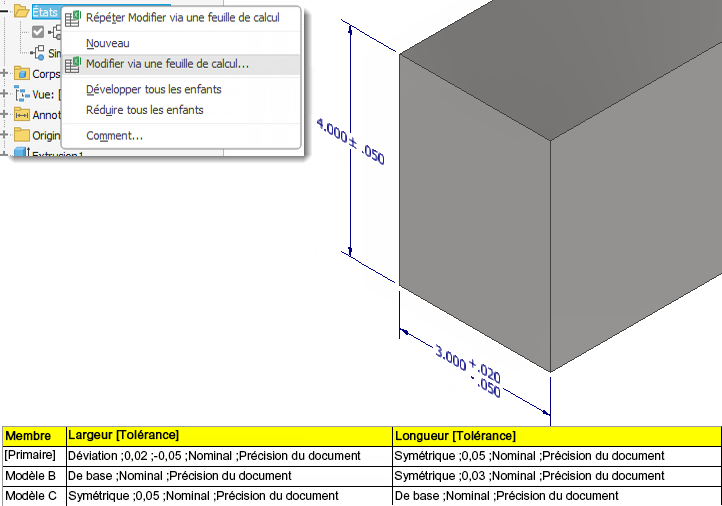 Les états de modèle de pièce et d’ensemble prennent désormais en charge la définition de paramètres de tolérance différents pour chaque état.