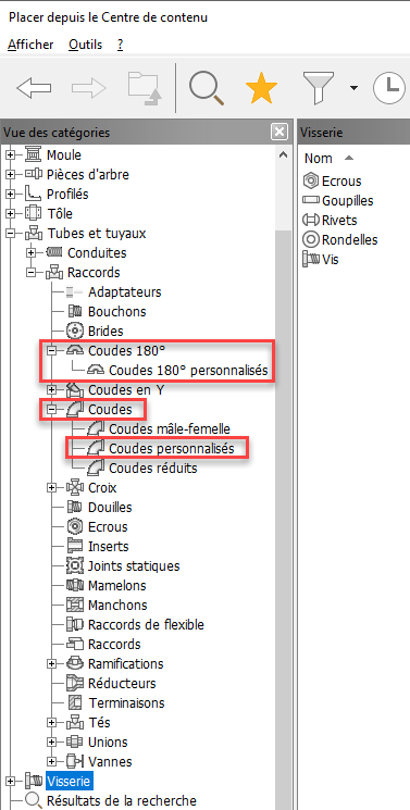 À côté de la bibliothèque de coudes personnalisés, la bibliothèque de coudes 180° personnalisés est également ajoutée. Les pièces des deux bibliothèques sont prises en charge pour être créées et publiées.