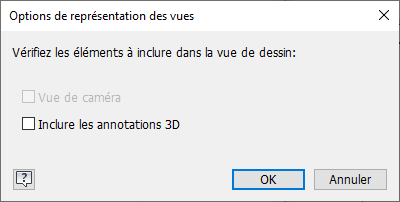 Cette action accomplit deux actions. Elle affiche les annotations 3D dans la vue et définit les options de vue à inclure dans un format de feuille.