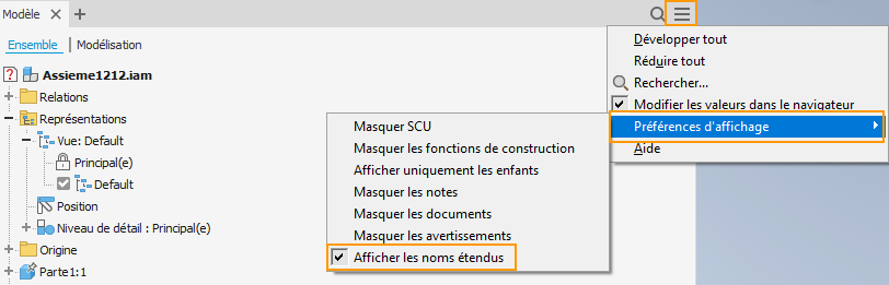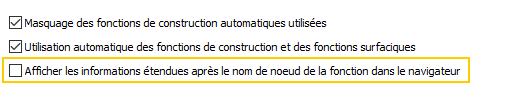 Les options Afficher les informations étendues après le nom de nœud de la fonction dans le navigateur (disponible à partir de l’onglet Options d’application/Pièces) et Afficher les noms étendus (disponible dans le menu de l’outil du navigateur Modèle) ont été améliorées afin de prendre en charge les commandes suivantes :