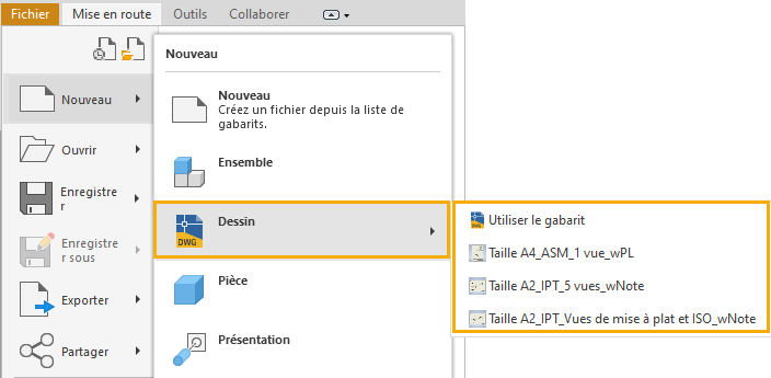 Dans le menu Fichier : le nouveau menu déroulant répertorie les gabarits de dessin et les formats de feuille enregistrés dans un fichier gabarit de dessin.
