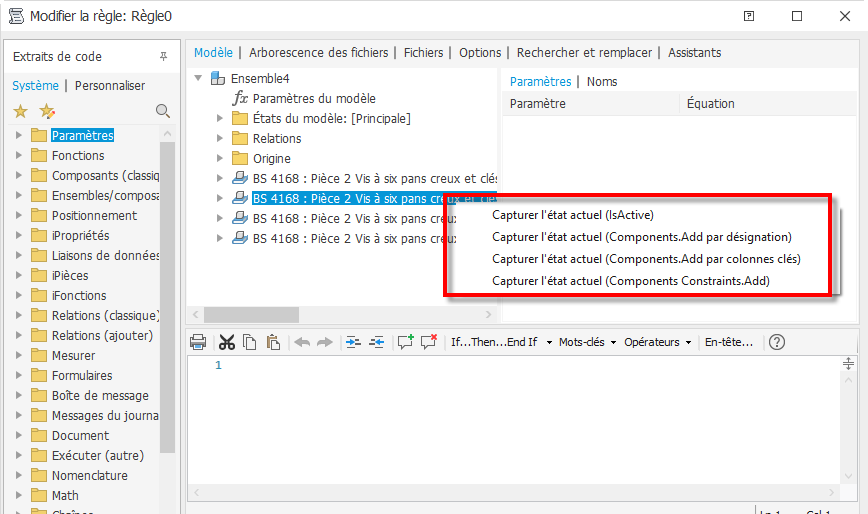 Une nouvelle option permettant de capturer l’état actuel a été ajoutée à l’éditeur de règles iLogic pour les pièces du Centre de contenu. Au lieu de capturer la désignation, il obtient les valeurs clés et fournit au code une liste nom-valeur. Il est ainsi plus facile de spécifier des valeurs requises individuelles, plutôt que d’avoir à les combiner en une seule valeur Désignation.