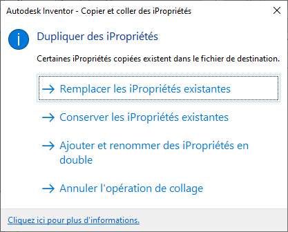 Lorsque vous collez des propriétés dans un autre document, s’il existe des doublons, vous êtes invité à indiquer l’action que vous souhaitez effectuer :