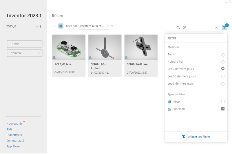 Filtrez la liste Récent et les résultats de la recherche à l’aide des filtres prédéfinis. Vous pouvez filtrer par type de fichier, par date de modification et par critère de filtre.