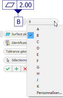 Lancez la commande Fonction de tolérance, sélectionnez la fonction, puis cliquez sur OK. Après avoir placé l’annotation, cliquez sur la liste déroulante pour afficher les options.