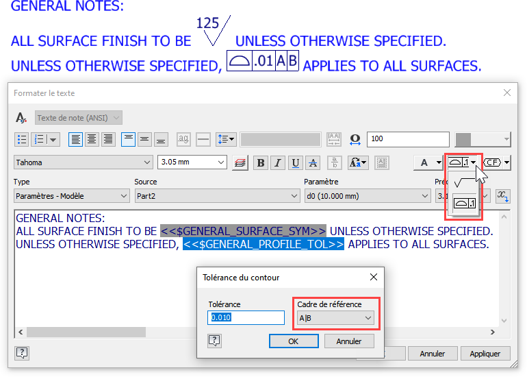 Le symbole de fonction continue est désormais disponible dans les boîtes de dialogue Modifier une cote et Formater le texte des annotations 3D.