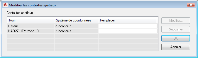 - Cliquez sur Modifier les systèmes de coordonnées et, dans la boîte de dialogue Modifier les contextes spatiaux, cliquez sur l’entrée.