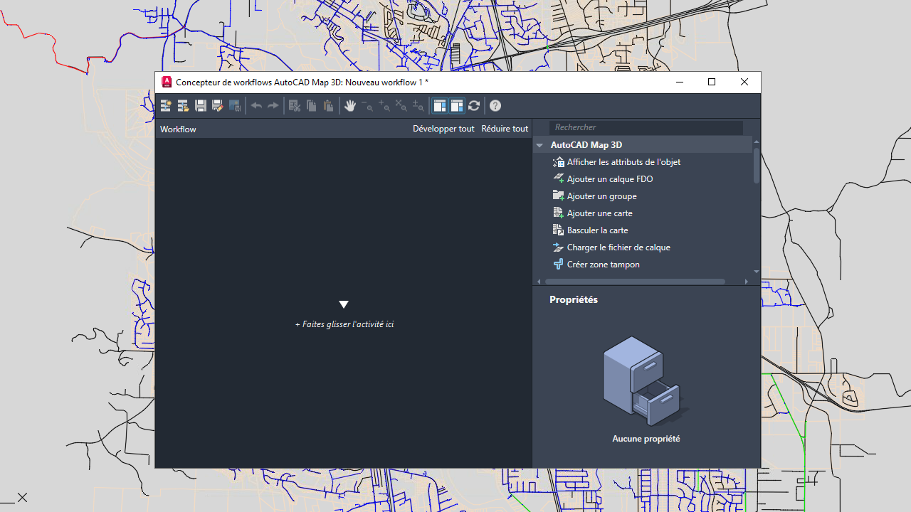 Le concepteur de workflow a été repensé et fonctionne désormais comme un outil d’édition plutôt que comme un outil d’exécution des workflows. Pour exécuter un workflow, vous devez l’enregistrer et revenir au jeu d’outils AutoCAD Map 3D 2025.
