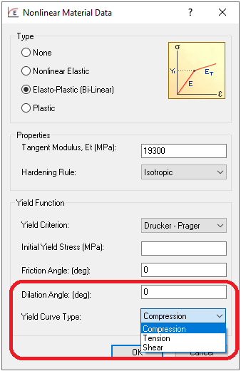 Les utilisateurs peuvent désormais entrer des propriétés de Drucker-Prager avancées, telles que l’angle de dilatation et le type de courbe d’élasticité, pour les matériaux bi-linéaires et non linéaires plastiques lorsque le type d’analyse actif est défini sur Explicite.