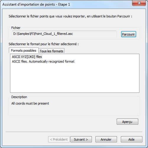 - Cliquez sur Géométrie > Points > Importer > Point unique de nuage de points. L'assistant d'importation de points s'affiche.