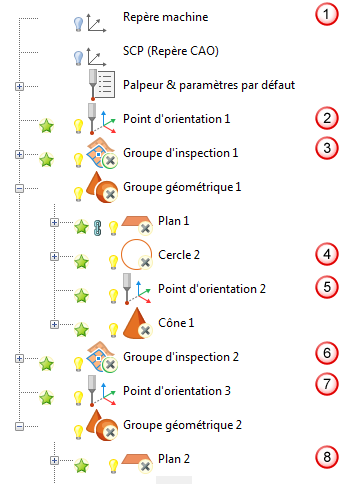 Vous pouvez placer des éléments de point d'orientation n'importe où dans le niveau de définition de la séquence. Vous pouvez également les utiliser dans un groupe géométrique pour orienter le palpeur avant ou après un élément.
