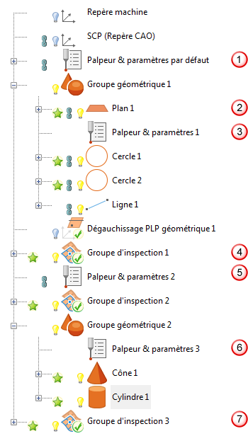 Vous pouvez placer les éléments de palpeur et paramètres dans le niveau de définition de la séquence d'inspection ou dans un groupe géométrique. Cela vous permet de spécifier et de changer l'outil de palpeur et les paramètres de palpage pour des éléments individuels, tout comme des intervalles d'éléments ou sur la séquence complète.