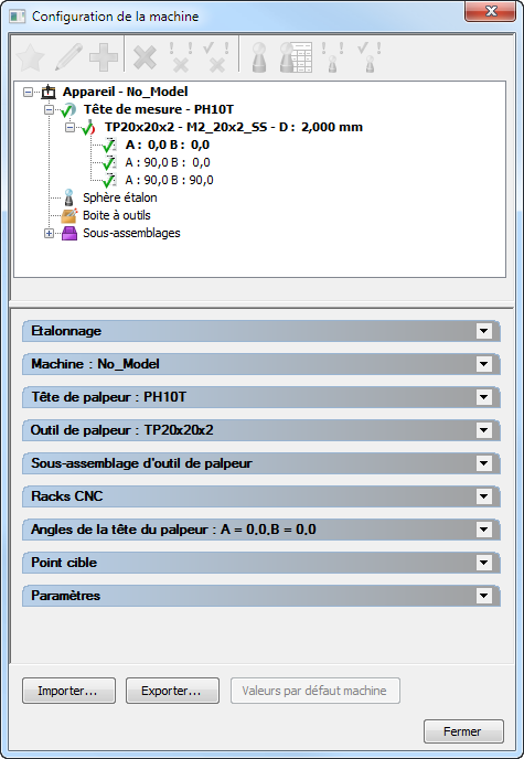 La boîte de dialogue Configuration de la machine affiche les détails de la configuration et de l'étalonnage de l'appareil de mesure pour lequel PowerInspect est actuellement configuré. Par exemple