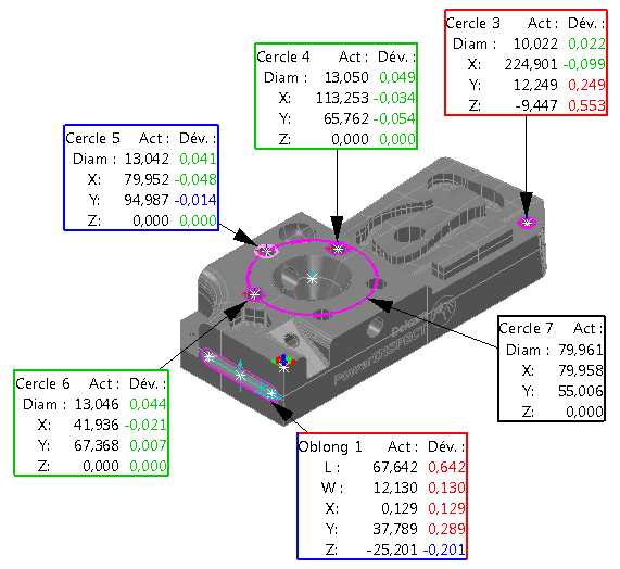 - Le noir indique que l'élément n'a pas été mesuré (par exemple, éléments construits), ou que les mesures n'ont pas été comparées avec les nominales de l'élément.