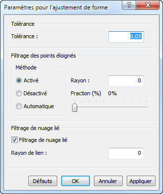 Utilisez la boite de dialogue Paramètres pour l'ajustement de forme pour changer les paramètres qui contrôlent comment les formes géométriques 3D sont sélectionnés depuis un nuage de points.