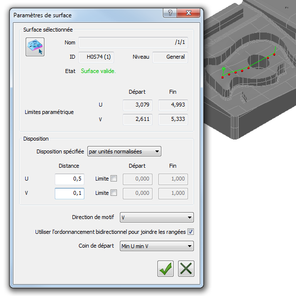 Les cases qui contrôlent les distances d'écart et de pas du parcours de palpeur dépendent des directions u et v de la surface sélectionnée. Ici, comme dans l'exemple d'unités paramétriques, la case U spécifie la distance d'écart entre les rangées et la case V spécifie la distance de pas entre les points.