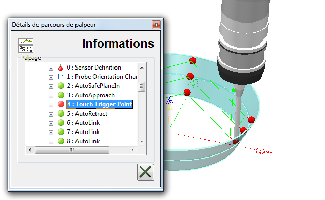 La boite de dialogue Informations vous permet de voir les détails du parcours de palpeur et de parcourir le parcours un mouvement à la fois.
