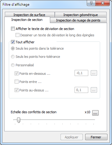 Pour filtrer l'affichage des points de section mesurés dans la vue CAO, cliquez sur Affichage > Options d'affichage > Filtre d'affichage et sélectionnez l'onglet Inspection de section.