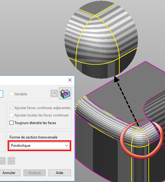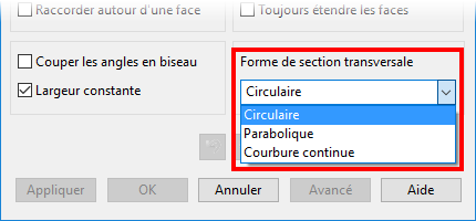 Avancée — Quand un parcours est sélectionné, cliquez sur Avancée pour créer un raccord à rayon variable en utilisant la boite de dialogue Raccord à rayon variable. Utilisez cette boite de dialogue pour insérer des arcs le long du parcours pour définir les valeurs de rayon différentes.