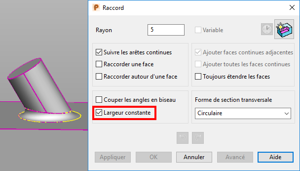 Appliquer — Crée un raccord le long du parcours sélectionné et la boite de dialogue reste à l'écran. Ceci s'applique aussi à n'importe quel changement fait au moment du dernier raccord créé. Une icône de raccord représentant l'opération apparaît dans l'arborescence de forme de solide.