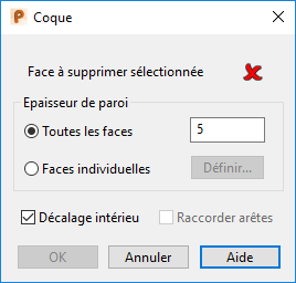 - Utilisez la boite de dialogue pour retirer une face d'un solide et la décaler pour créer une coque de solide.